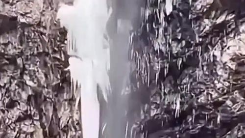 视频显示,在黑山岔,一大块冰柱突然坠落,砸在山石和冰瀑布上后碎裂,正在冰瀑布下玩的人纷纷躲避,不少人滑倒。