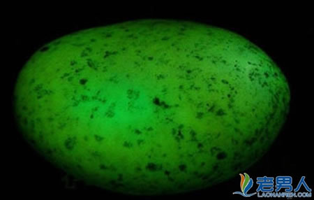 在手电筒几秒的照射下,夜间就能明显看见绿色的光源,并可以持续很长时间。据彭先生说,要是在太阳底下吸收几分钟光热,可以持续发光三天三夜,一共有三层颜色的光源,一层是绿色的,中间层是淡蓝色,最里面是白色,在黑夜里格外醒目耀眼,如同一大颗珠光宝气的翡翠,照亮整个房间。
