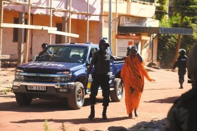 11月20日,在马里首都巴马科,一名获释的人质在警察护送下离开。新华社发
