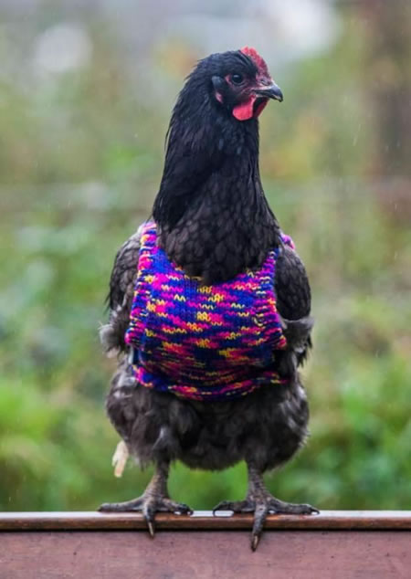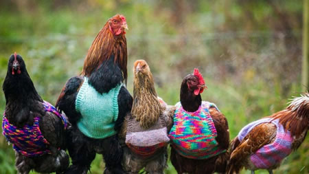 冬季来临,英国康沃尔(Cornwall)一家农场里的圈养鸡纷纷穿上了手织套头衫过冬。图为5只小鸡身着五彩斑斓的套头衫站在栅栏上休息。冷峻的表情、不羁的站姿,看起来颇有黑帮派头。