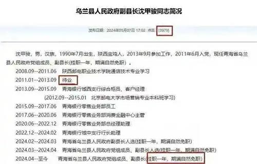 近日,一则“90后银行柜员成副县长”的消息引发网友热议。网传简历显示,青海省乌兰县挂职副县长沈甲骏,曾在青海银行城西支行综合柜员岗工作,2022年升任青海银行城中支行行长助理,2024年2月份进入乌兰县人民政府挂职副县长。