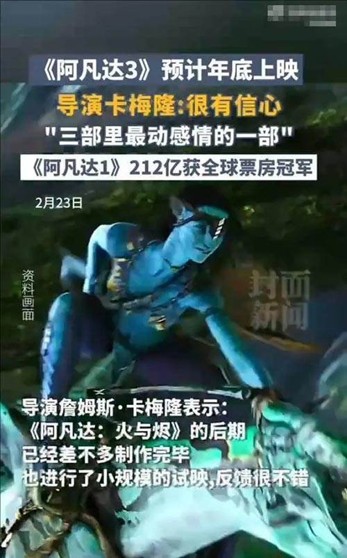 近日,《阿凡达》系列电影导演詹姆斯·卡梅隆接受了媒体的采访,他表示,阿凡达电影第三部《阿凡达:火与烬》的后期已基本制作完毕,也进行了小规模试映,反馈不错,他称对《阿凡达3》很有信心,同时还透露可能会在2025年底北美上映。