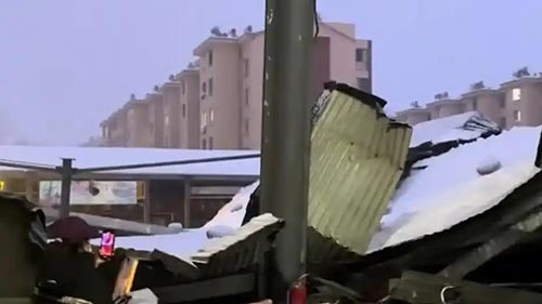 视频显示,在一处农贸市场内,棚顶部分出现坍塌,坍塌部分可见厚厚的白雪。