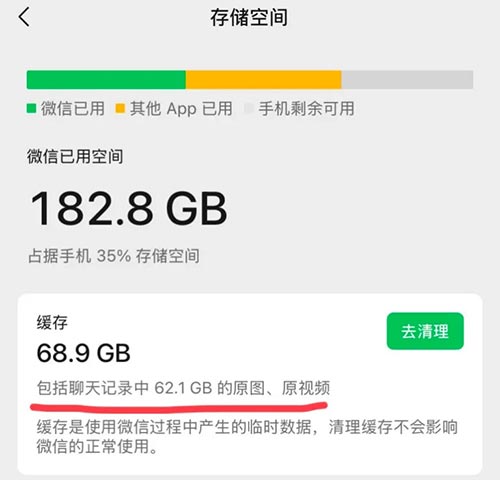 作为已上线超14年的应用,微信承载着很多用户生活、工作的海量信息。随着使用时长与日俱增,用户的存储压力日益凸显。有研究发现,聊天记录往往占据微信80%以上的存储空间。此外,移动设备摄像头像素升级,让高清内容渐成存储负担,原图、原视频愈发成为占据存储空间的大头。以某重度用户为例,其微信已用空间182GB中,原图、原视频独占62GB,占比高达34%。目前,已有用户实测,清理体积庞大的互发原图/原视频后,手机成功“减重”超三分之一。