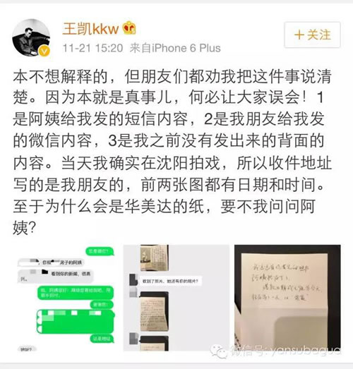 对此,王凯今日终于在微博回应对于传言信件造假一事,发文道:“本不想解释的,但朋友们都劝我把这件事说清楚。因为本就是真事儿,何必让大家误会!1是阿姨给我发的短信内容,2是我朋友给我发的微信内容,3是我之前没有发出来的背面的内容。当天我确实在沈阳拍戏,所以收件地址写的是我朋友的,前两张图都有日期和时间。至于为什么会是华美达的纸,要不我问问阿姨?”言语间满是无奈,而在王凯提供的图片中也可以看到,房东阿姨是11月11日联系到王凯并于当天把信件和照片寄到了王凯提供的朋友地址,隔天王凯就收到了朋友的消息,表示信件已到。而至于为什么信的落款是11月12日,王凯则解释称这是阿姨觉得“12”是“要爱”的意思。