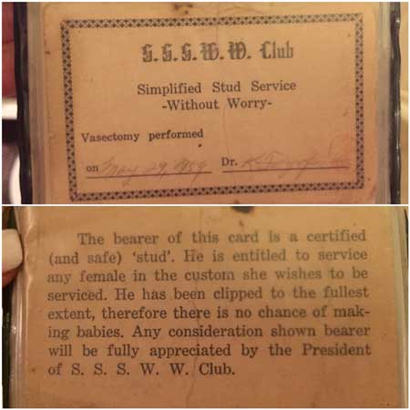 在已经泛黄的纸张上,写有其祖父的签名和落款日期1959年5月29日。证书内容写道:持证者可以安心做“男妓”,并且可以接待任何女性客户,因为被结扎,所以不用担心会导致顾客怀孕。持卡人如有疑问,俱乐部都将热心处理。
