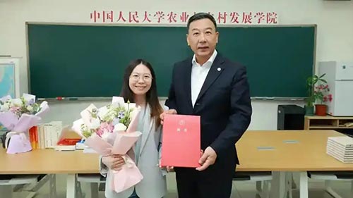 记者从中国人民大学获悉,4月2日,中国人民大学党委书记张东刚前往该校农业与农村发展学院,为破格晋升为教授的叶紫薇送上聘书。