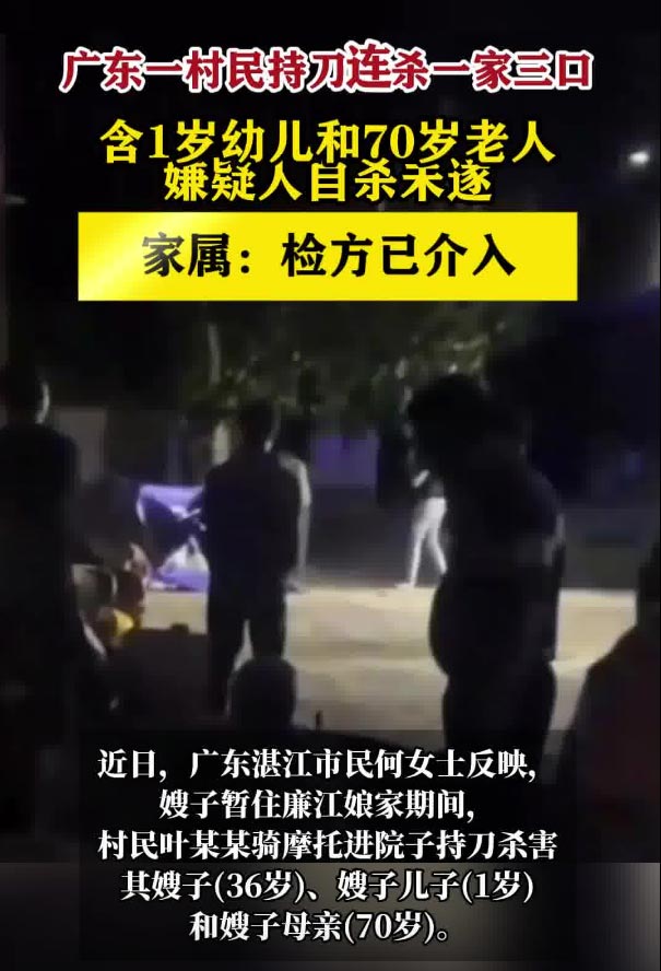 近日,广东湛江市民何女士反映,嫂子暂住廉江娘家期间,村民叶某某骑摩托进院子持刀杀害其嫂子(36岁)、嫂子儿子(1岁)和嫂子母亲(70岁)。