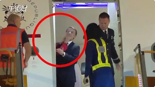据报道,法国总统马克龙及夫人当地时间25日晚抵达越南河内,开启东南亚之行。有网友在直播画面中发现,当飞机舱门打开时,第一夫人布丽吉特正“用手堵住马克龙的嘴”。有媒体报道称,视频显示布丽吉特的手疑似“打到”马克龙的脸。马克龙发现舱门已被打开,立刻微笑向欢迎队伍打招呼。