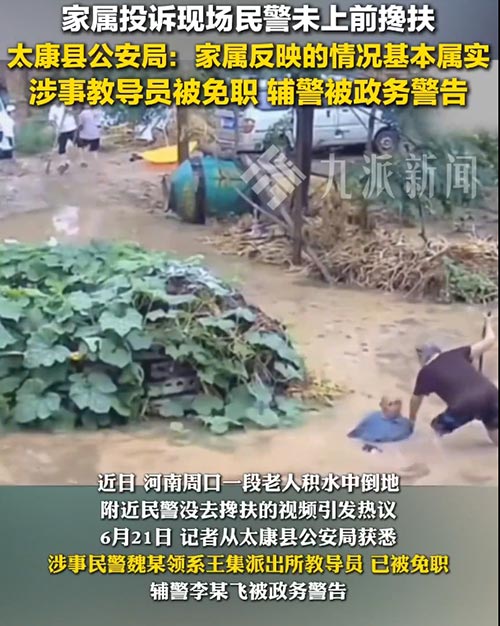 6月21日报道,河南周口。太康县王集乡葛岗村的冯先生反映,19日下午,因家中淹水,他的父母在向外转移时,父亲不慎摔倒水中,现场民警未上前搀扶。