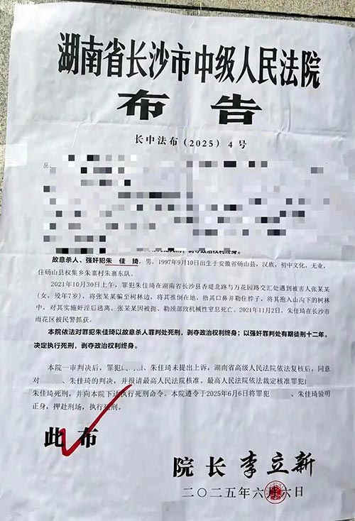 法院布告称,故意杀人、强奸犯朱佳琦,男,1997年9月10日出生于安徽省砀山县,汉族,初中文化,无业,住砀山县权集乡。2021年10月30日上午,罪犯朱佳琦在湖南省长沙县一路口交汇处遇到被害人张某某(女,殁年7岁),将其骗至树林边,推倒在地,捂其口鼻并勒住脖子,将其抱入山沟下的树林中,对其实施奸淫后逃离。张某某因被扼、勒颈部致机械性窒息死亡。2021年11月2日,朱佳琦在长沙市雨花区被民警抓获。