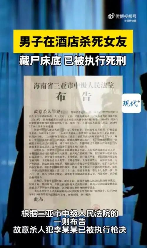 现代快报讯 (记者 孙玉春)近日,海南省三亚市中级人民法院的一则布告显示,已经对故意杀人犯李某某执行了枪决。