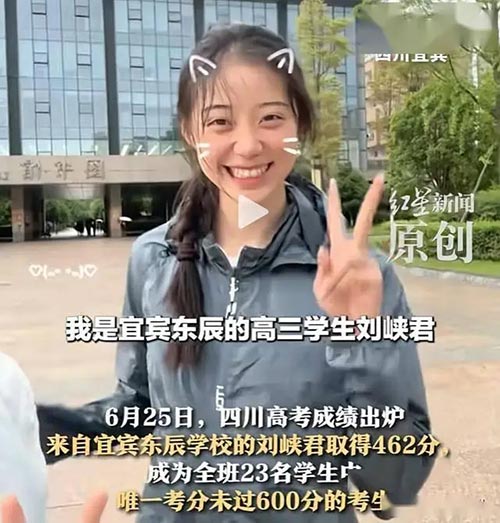 6月25日,四川2025年高考成绩正式放榜。在宜宾市东辰学校,一个班级的高考成绩格外引人注目:该班23名学生中,竟有22人分数超过600分,成绩十分亮眼。然而,在这份耀眼的成绩单中,一名叫刘峡君的女生却以462分的成绩成为班级里的“显眼包”。