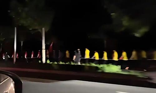 7月13日,有市民反映称,在山东淄博文昌湖景区,凌晨时有数十人蒙眼列队行走。一名目击者告诉红星新闻记者,当时是在景区人行道上,一群人穿着统一的黄色和红色衣服,蒙着眼手拉着绳子边播放说教录音边行走。