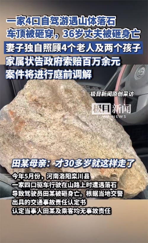 今年5月份,河南洛阳栾川县,一家四口驱车行驶在山路上时遭遇落石,导致两个孩子的父亲、小轿车驾驶员田某被砸身亡。7月13日,@极目新闻 记者从田某家属处了解到,他们已经向法院提交诉状,向当地政府及交通部门索赔百万余元,本月将进行庭前调解。目前,田某遗体尚未下葬。