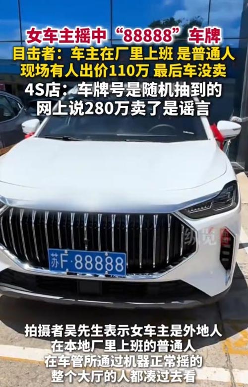 据现场目击者吴先生讲述,当天下午,这位女车主如往常一样来到车管所,按流程进行新车的车牌随机选号。当她按下选号键的那一刻,屏幕上赫然跳出 “苏 F・88888” 的车牌号,刹那间,整个选号大厅沸腾了。“当时所有人都围了过去,大家都不敢相信,一个普通打工者能摇到这样的车牌,简直太幸运了。” 吴先生说道。