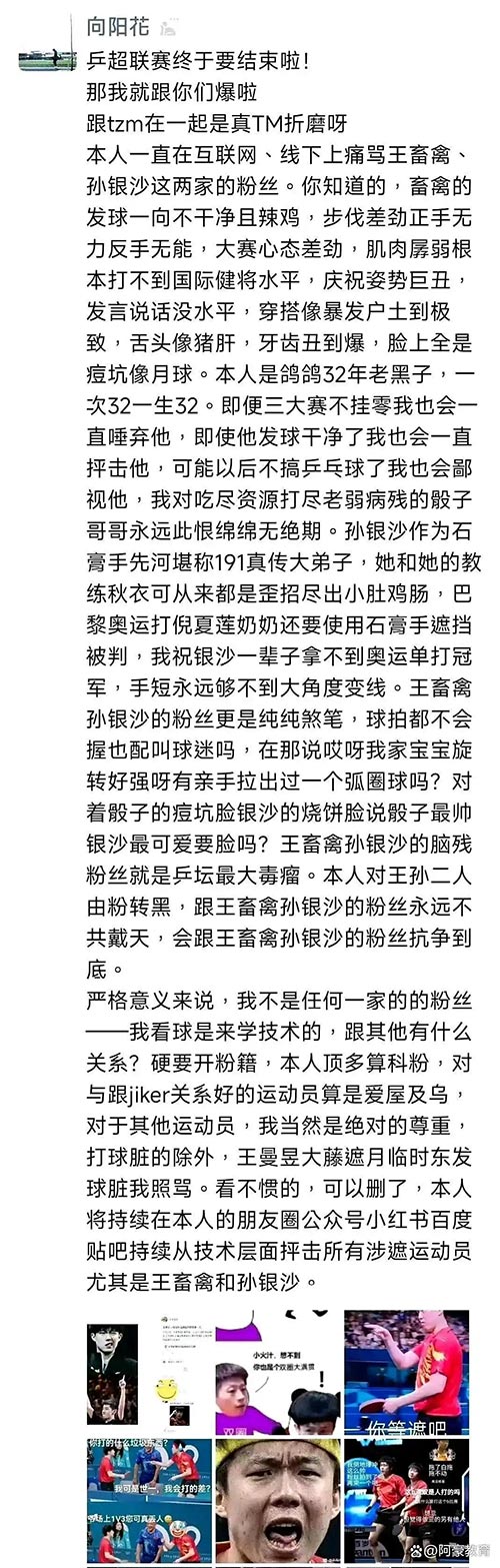 更令人咋舌的是陈某个人的网络用语习惯。 他把王楚钦称作“王畜禽”,造谣孙颖莎“发球作弊”,用“石膏手”贬低她的技术,甚至详细描述“舌头像切开的猪肝色”这类人身攻击。 有网友截获他在私人群里的嚣张发言:“发朋友圈怎么了? 我老师也有喜欢的运动员! ”当有人提醒这样太极端,陈某直接回怼:“极端粉丝? 她们自己都没出来说我! ”