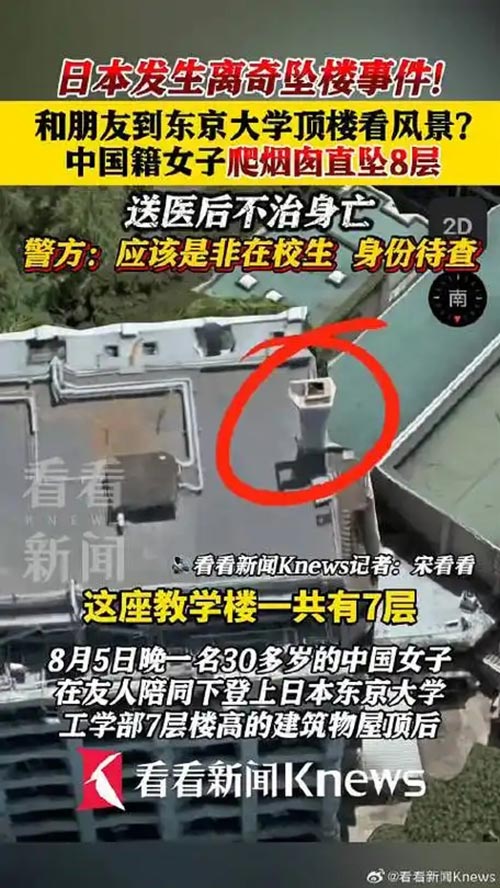 8月8日,30多岁中国籍女子从日本东京大学一栋7层建筑烟囱内坠落身亡,事发地画面曝光。