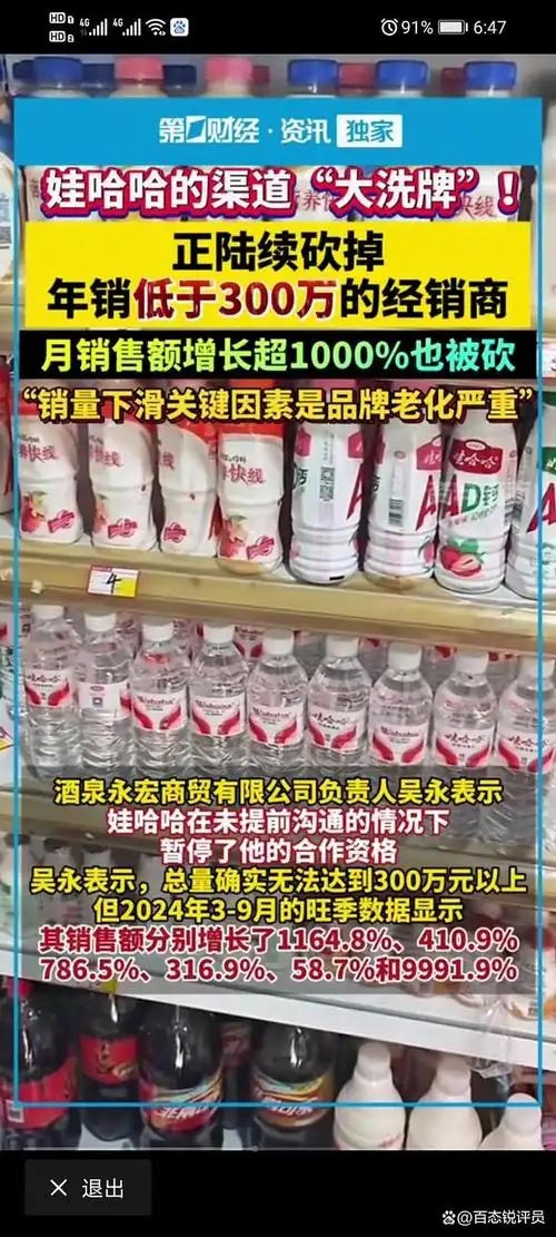 酒泉永宏商贸有限公司负责人吴永对第一财经记者透露,酒泉当地有两家娃哈哈经销商,一家负责老产品,一家负责新产品。负责老产品的经销商年任务量在800万元左右;吴永负责新产品业务,是娃哈哈在当地的二级经销商。2024年9月,娃哈哈宣布停止与年任务量300万元以下的经销商合作,吴永也在被清退之列。娃哈哈在未提前沟通的情况下,暂停了吴永的合作资格。