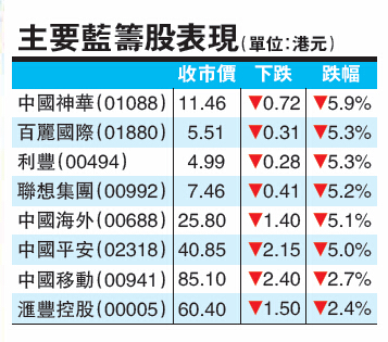 蓝筹四大权重龙头股全线跌幅超过2%,合共拖低恒指近190点。汇控(00005)股价回吐2.4%,跌至60元边缘,报60.4元;中移动(00941)跌2.7%,报85.1元。友邦(01299)、腾讯(00700)分别跌2.4%、2.2%,报45.45元和149.1元。
