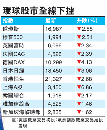 2016年首个交易日,环球主要股市全线下跌。中国股市急泻,触发熔断机制停市。另一边厢,沙特与伊朗交恶,地缘政治紧张局势升温,外围股市下跌。美国道琼斯指数昨晚低开19点后,沽压持续,初段曾跌逾430点,跌幅逾2.5%,失守17000点;标普500指数曾跌50点,跌幅约2.5%,跌穿2000点。