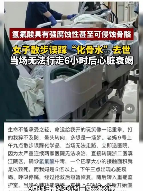 据此前报道,9月14日晚,网友“LIV元宝”发文称,母亲9日上午9点外出散步时误踩到化学品氢氟酸,当场便无法行走,送医后被确诊氢氟酸中毒。下午3点开始出现心脏衰竭、呼吸停跳,送入ICU后当晚心肺功能衰竭,最终离世。