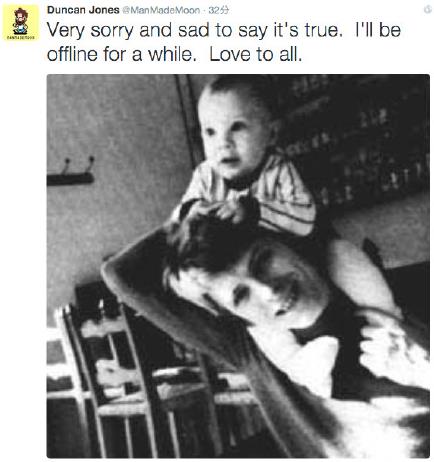 在鲍伊去世后,他的儿子邓肯·琼斯也在推特上表示了悼念之情。这位大导演(《月球》《源代码》以及将于今夏上映的《魔兽》)写道:“很遗憾和悲痛地告诉大家,这个消息是真的,我将会离线一段时间,爱你们所有人。”