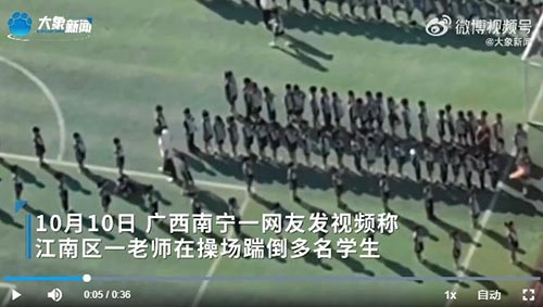 10月10日,有网友发布视频称,广西南宁市江南区一老师在操场踹飞学生,引发关注。相关视频显示,一老师用脚接连踹倒两个学生,并疑似指着第三个学生言语辱骂。
