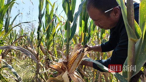 “这是今年秋天第一个连续大晴天!”廖辉从玉米地出来,白色的鞋子沾满泥巴,站在地头用手挡着额头,举首凝望只有一个白点的太阳,“我今年种了170亩玉米,还有90亩没收,再晒几天,地里就干了,收割机就可以下地了,如果都是这品相,今年我这晚熟玉米,算是损失不大。”