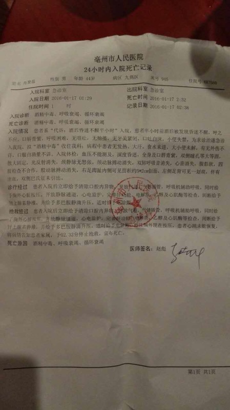 亳州市人民医院开具的入院死亡记录显示,肖聚磊的死亡原因为“酒精中毒、呼吸衰竭、循环衰竭”。