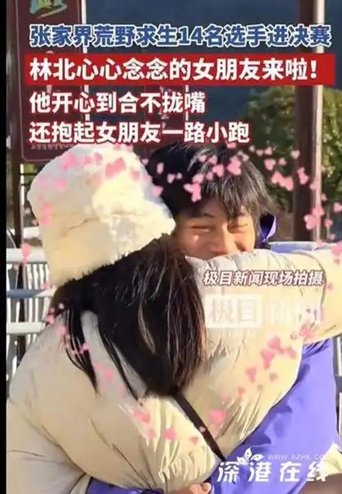 【荒野求生林北终于接到女朋友】11月19日,湖南张家界七星山荒野求生挑战赛27号选手张博林(抖音号“荒野林北”)在决赛休整期接到女友探访。女友带来四川宜宾特产,二人甜蜜互动引发关注,林北更抱着女朋友一路小跑。湖南张家界七星山景区游客中心,进入七星山荒野求生挑战赛决赛的人气选手林北正在等待女友和家属的到来。8时30分许,林北接到哥哥电话,说已经到了。林北从游客中心的沙发上站起,跑到门口的立柱旁张望,看到女友和亲属,立即躲起来。“想给女朋友制造惊喜……”林北清秀的脸庞笑容灿烂,他趁女友没看到他,又躲到一个旅游大巴车后,再次躲起来。不久,林北按捺不住激动,快步跑到女友身后,一把将女友抱起,两人热情拥抱。随后,林北与亲属打完招呼后,再次一把将女朋友抱起,走向上山的索道方向。在被问及见到男朋友开不开心时,“开心!”林北的女友戴着帽子和口罩,她笑着称。这场由张家界文旅局主办的第二届荒野挑战赛,自10月9日开赛以来便备受关注。参赛者需在无现代工具辅助下,于七星山原始丛林中完成生存任务。林北作为唯一公开恋情的选手,其“为女友赢奖金”的参赛动机从一开始就充满戏剧性:他不仅用树皮雕刻两人姓名缩写挂在庇护所门口,更因连续8小时徒步寻找露营地、用野果酿制“果酒”等操作,被网友戏称为“荒野界李子柒”。“他总说要多存点柴火,等女友来了能烤火取暖。”赛事工作人员透露,林北的物资储备远超其他选手——其庇护所内不仅存有3个月用量的干燥木柴,更用竹筒密封保存了熏制肉干和草药茶。这种“精致求生法”虽遭部分选手质疑,却意外赢得观众好感:数据显示,其直播间62%的观众是冲着求生技巧而来,但真正让他爆红的,却是那些藏在生存细节里的温柔。