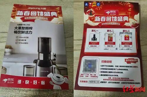 郭女士向红星新闻记者提供了快递包裹里的“京东家电中奖券”。这张中奖券醒目位置印着“京东新春回馈盛典”,奖券上印有支付宝、京东、美团、饿了么的标识。