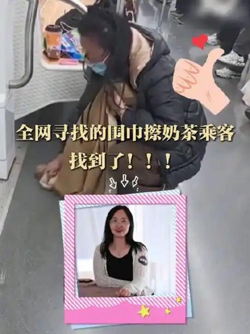 据苏州广电总台蟹视频报道,12月7日,全网寻找的在苏州地铁上用围巾擦地上奶茶的女乘客找到了,她姓顾,是苏州区工业园区一家公司的职员。