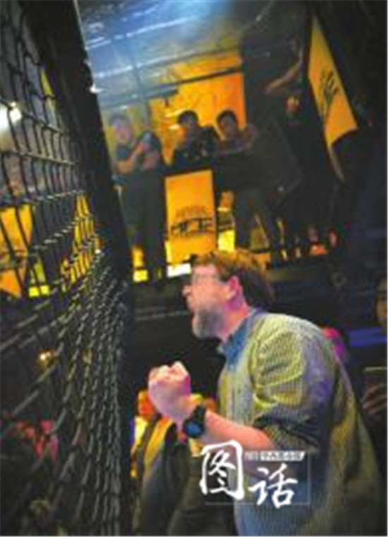 这是一家酒吧,5米多的层高,几乎没有内饰装修。四周安装了铁制楼梯和简易平台,形成环形看台,台下正中是个10平米左右的铁笼。灯光昏暗,电子音乐轰轰作响。狂欢还未正式开始,DJ摇头晃脑,显得有点漫不经心。