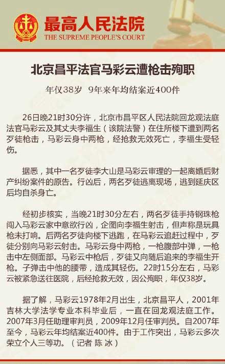 【北京昌平法官马彩云遭枪击殉职】26日晚21时30分许,北京市昌平区人民法院回龙观法庭法官马彩云在住所楼下遭到两名歹徒枪击,经抢救无效死亡。据悉,其中一名歹徒李大山是马彩云审理的一起离婚后财产纠纷案件的原告。自2007年至今,马彩云年均结案近400件。由于工作突出,马彩云多次荣立个人三等功。