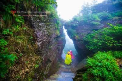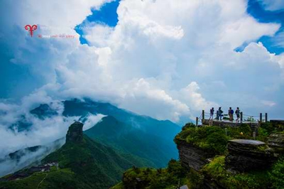 新金顶。梵净山最具特色的标志性景观,海拨2375米,突兀挺拔,高近百米。如巨笋出土,似玉龙啸天,红云环绕,直指苍穹。金顶正中,有一金刀峡,将山顶一分为二,分别建有释迦殿、弥勒殿,两殿中间有一天桥相连,蔚为雄奇壮观。