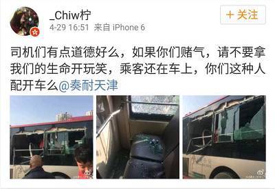 4月29日下午四点多,网友@@_Chiw柠发微博称:司机们有点道德好么,如果你们赌气,请不要拿我们的生命开玩笑,乘客还在车上,你们这种人配开车么?