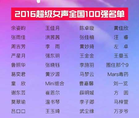 5月2日《2016超级女声》20名正式生名单及100强名单新鲜出炉!2016版超级女声一改以往选秀比赛的淘汰赛制,采取“20名正式生+80名预备生+N名插班生”的模式,赛制更加开放也更残酷,每个选手都有机会留到最后,也就意味着不到最后,每个人的命运还是个未知数。