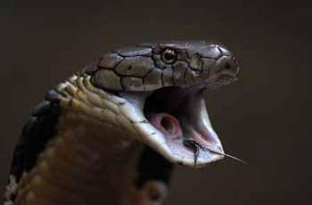 原来咬钱老师的蛇是眼镜蛇,戴医生让我们仔细看了一下眼镜蛇在受到刺激准备进攻时的表现。原来,眼镜蛇与其他的蛇不一样,每当受到刺激它就会让颈部膨扁,使前半身直立起来,让头部在高处迎敌。专家说,使头部可能跃起来的关键就是这种颈部变形。