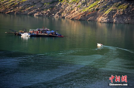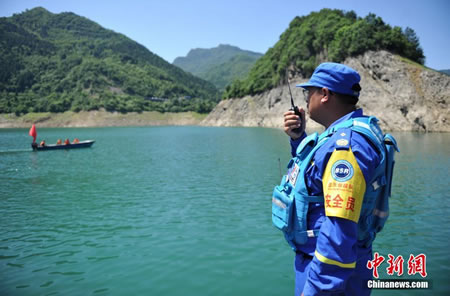 6月8日,四川广元白龙湖“双龙号”游船翻沉搜救现场,水下机器人再次在沉船附近水域发现3名遇难者遗体,正在进行身份确认。图为救援人员将水下机器人放入游船翻沉水域开展搜寻。(拍摄于6月7日) 中新社记者 刘忠俊 摄