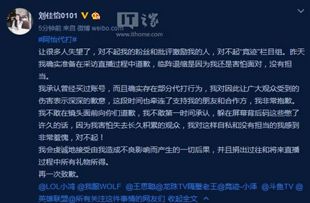 让很多人失望了,对不起我的粉丝和批评激励我的人,对不起“竞迹”栏目组。昨天我确实准备在采访直播过程中道歉,临阵退缩是因为我还是害怕面对,没有担当。