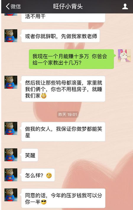 而这《时代报》官微发布的另一张图片则更加露骨。图片中,名叫“旺仔小背头”的人百般挑逗对方,“别上班了,我养你啊”“啥时候跟你男朋友分手啊,分了跟我吧”……