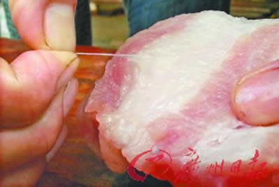 据悉,针对“猪肉有虫”不良影响的传闻,早在前些日子,徐闻工商、畜牧、食品等部门联合组成调查行动小组,深入市场开展全面细致的调查工作,截至当前,调查行动小组未发现一宗猪肉生虫的案例。该县畜牧、食品等部门有关人员相继解释称,合法生猪定点屠宰都是经过严格检验合格后才上市销售的,在屠宰程序中还要检查是否有寄生虫和传染病,屠宰完成后盖上印章,出具产品检疫合格证明方可上市。谣传中所说的“猪肉生虫”、“肉中虫开水煮不死”等,都是不真实的信息。图为这些肌筋可以拔出。
