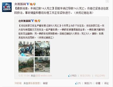 中国独家报道【河北张家口:车辆失控致14人伤亡】记者从张家口市宣传部门获悉,16日上午8时16分,张家口市五一东大街和林园路交叉口发生一起较大交通事故,目前造成14人伤亡。事故由一外地车辆失控所致。伤者已紧急送往医院抢救,当地启动事故处理紧急预案。事故调查和善后处理工作正在进行中。