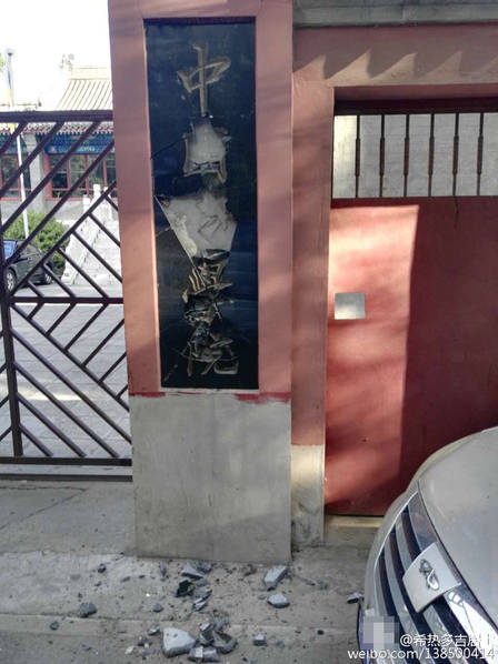 2016年9月6日上午,位于北京市西城区的法源寺和中国佛学院大门遭人恶意打砸、喷漆。图为被砸的中国佛学院大门。
