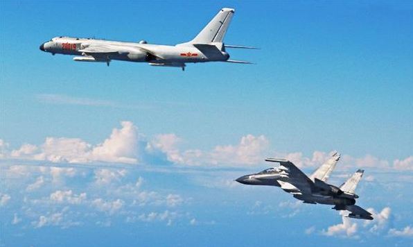 日媒公布的飞越宫古海峡上空的中国轰6K和苏-30战机。