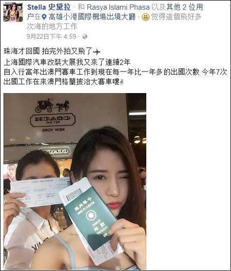 根据史黛拉在Facebook上发的照片,从9月23日起,就一直在上海参加“中国(上海)国际汽车商品交易会”活动。 9月22日,史黛拉从高雄飞上海参加活动,她在Facebook上称之为“出国”。