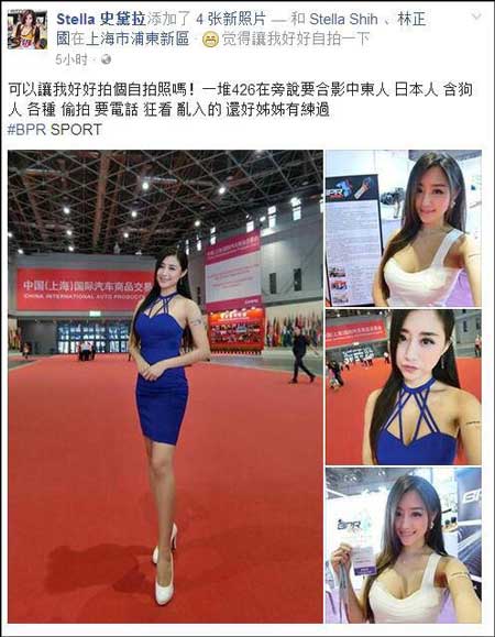 据@台湾那些事儿9月28日爆料,近日,一位名为Stella史黛拉的台湾模特在上海国家会展中心参加“中国(上海)国际汽车商品交易会”,但今日(9月28日),该模特在Facebook发文骂大陆人“426”,称“可以让我好好拍个自拍照吗!一堆426在旁说要合影中东人日本人含狗人各种偷拍要电话狂看乱入的还好姐姐有练过。”