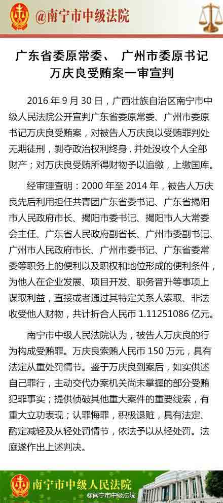 #万庆良受贿案一审宣判# [万庆良:受贿罪一审判处无期徒刑]2016年9月30日,广西壮族自治区南宁市中级人民法院公开宣判广东省委原常委、广州市委原书记万庆良受贿案,对被告人万庆良以受贿罪判处无期徒刑,剥夺政治权利终身,并处没收个人全部财产;对万庆良受贿所得财物予以追缴,上缴国库。