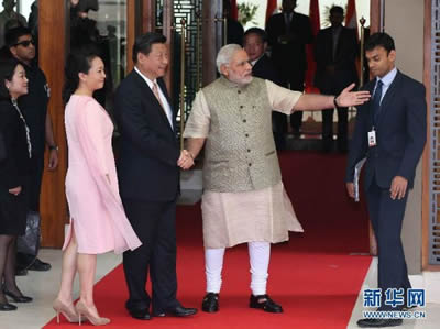9月17日,国家主席习近平在印度古吉拉特邦进行访问。印度总理莫迪全程陪同。这是习近平和莫迪亲切会见。